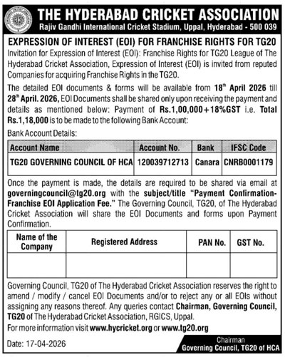 The Hyderabad Cricket Association is registered as a society under the Andhra Pradesh (Telangana Area) Public Societies Registration Act, 1350 Fasli, having its registered office at Rajiv Gandhi International Cricket Stadium, Uppal, Hyderabad 500039, Telangana India, a duly affiliated state unit of the Board of Control for Cricket in India, is pleased to announce the launch of the inaugural season of the TG20, scheduled to commence in June 2026.